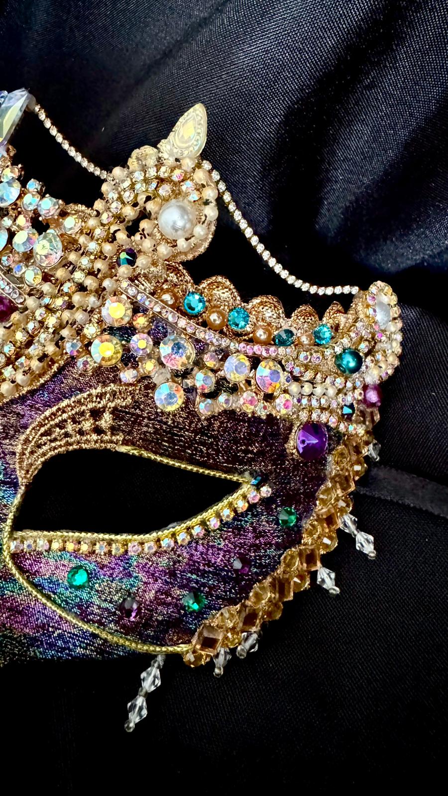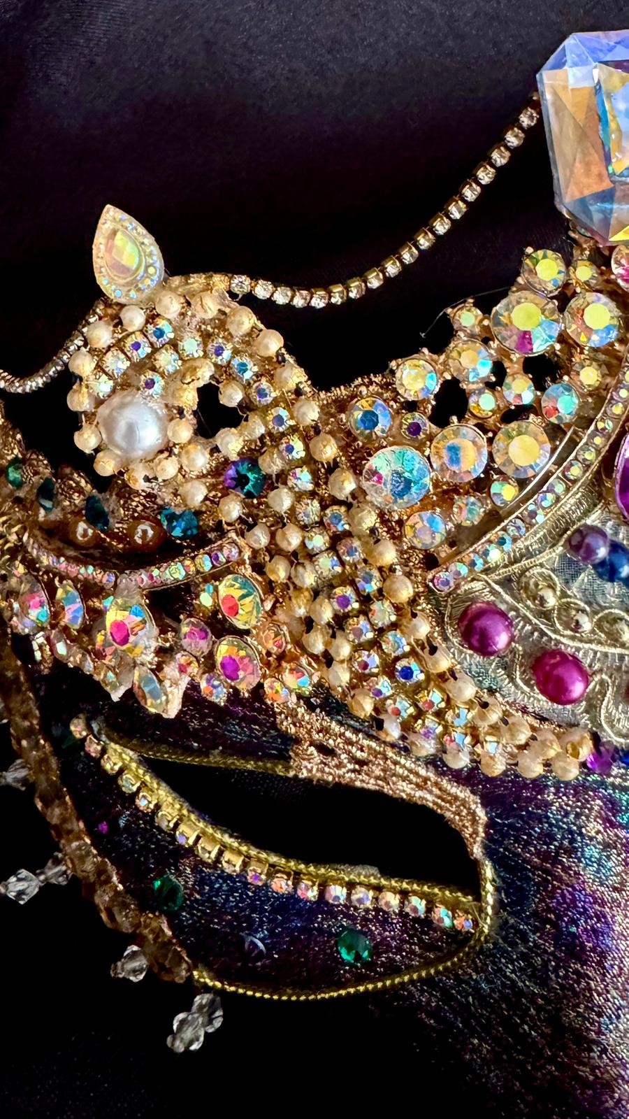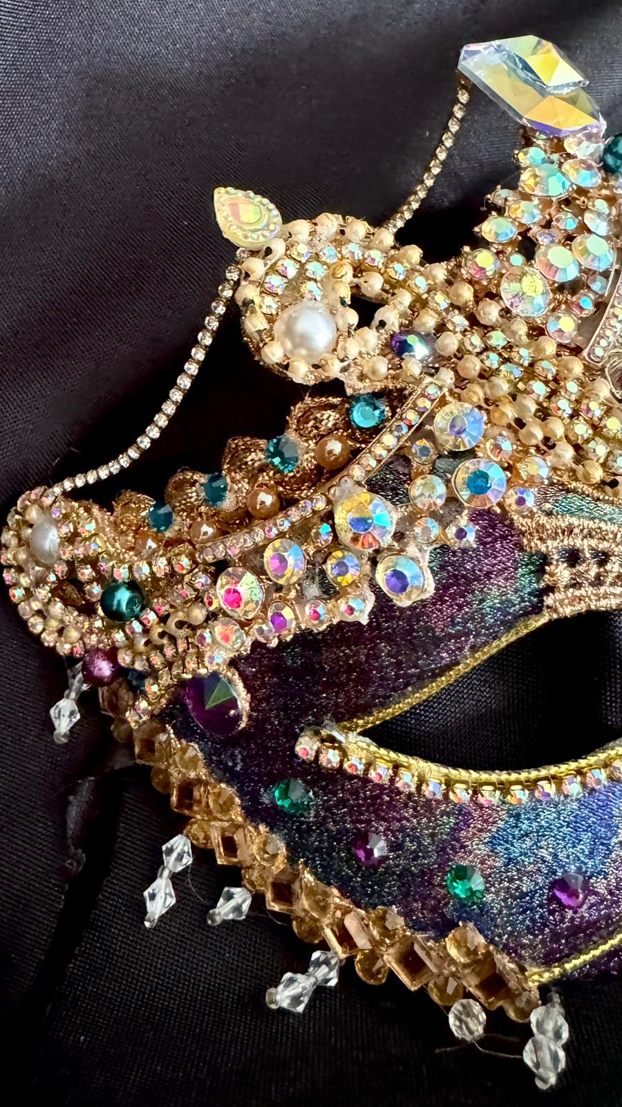 The bottom edge of the mask has been overlaid with gold-toned mirror-tiles and rhinestones under which a delicate clear crystal fringe provides a subtle balance to the upper ornateness of this piece.