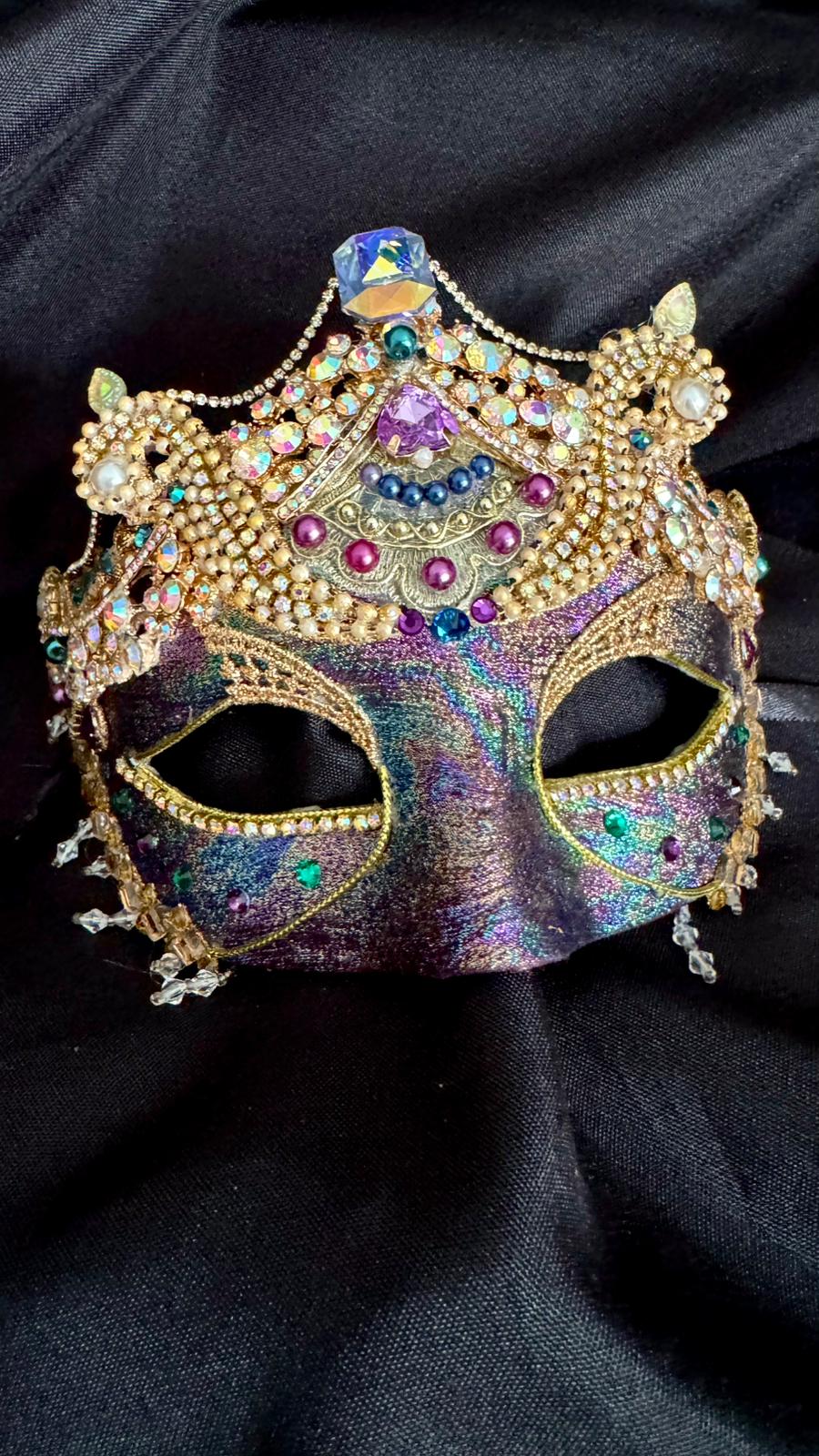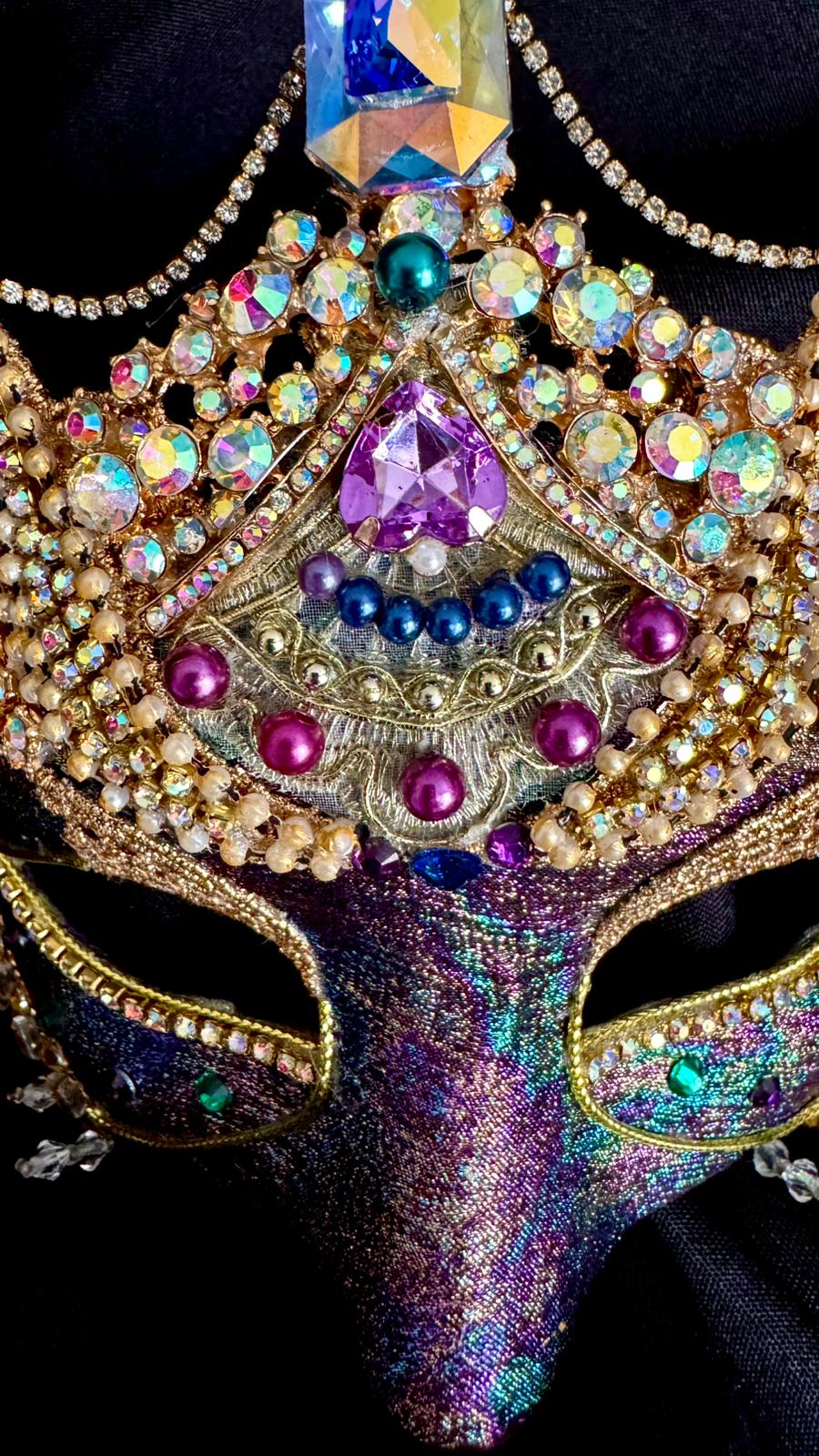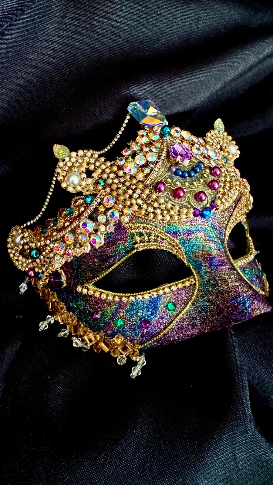 The bottom edge of the mask has been overlaid with gold-toned mirror-tiles and rhinestones under which a delicate clear crystal fringe provides a subtle balance to the upper ornateness of this piece.
